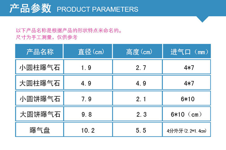 使用壽命長達10年。特別適用于城市污水、大 型用水工廠新建擴建和老曝氣池改造。曝氣頭接口方式有4分口,6分口,可內或外螺紋。